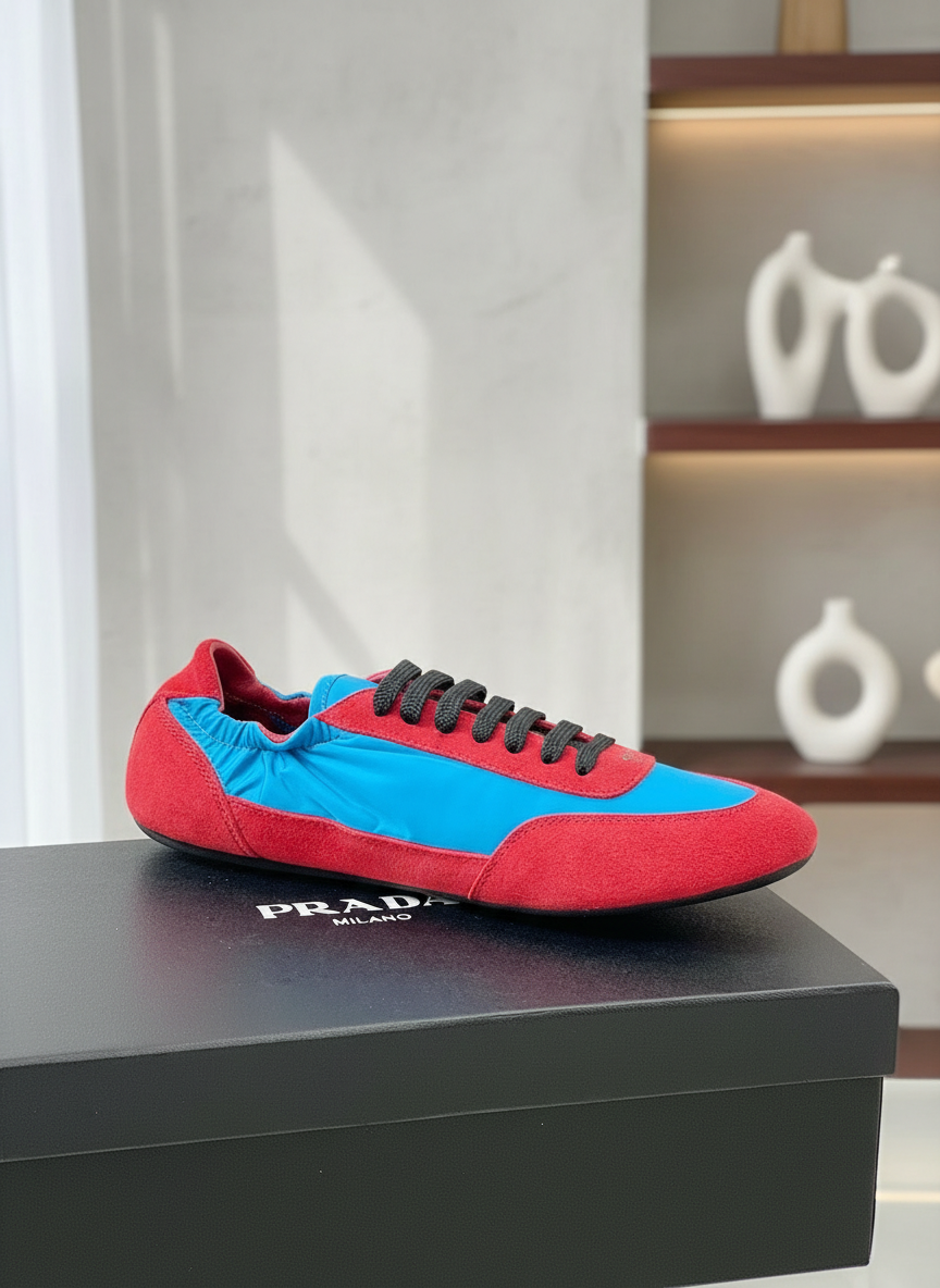 Prada Men’s Red and Blue Suede Sneakers, stylish low-top design with black laces, perfect for casual wear and adding a bold luxury touch to your outfit.