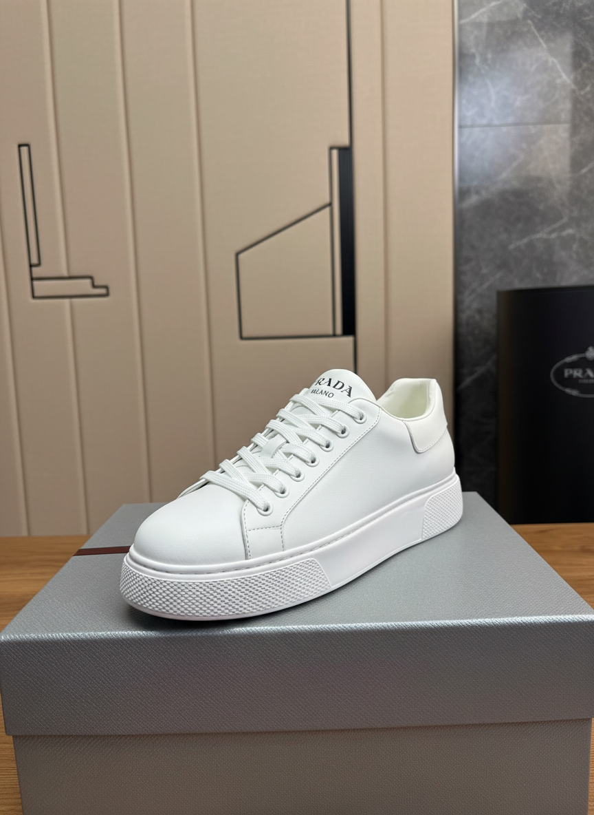 Prada White Leather Sneakers for Men, Classic Low Top Design, Comfortable Rubber Sole, Luxury Fashion Casual Shoes for Everyday Wear