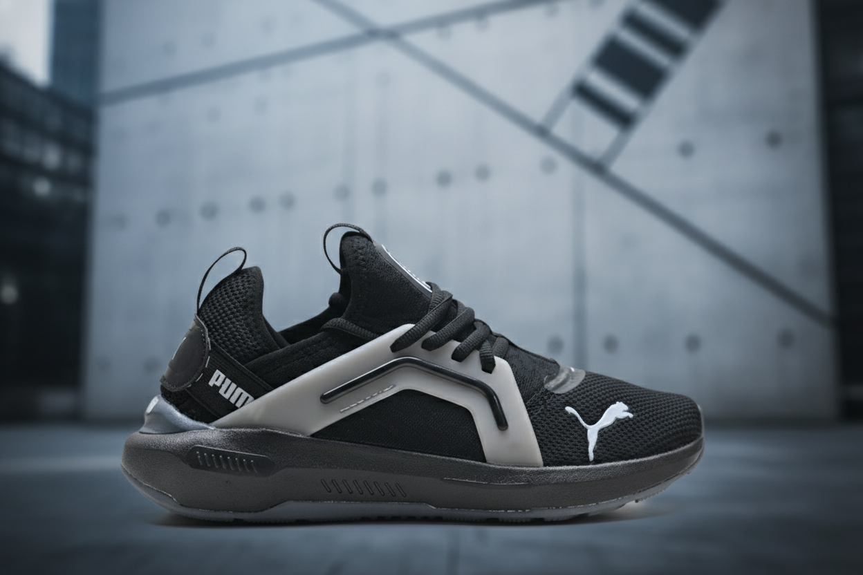 PUMA Men’s Black Running Sneakers, breathable mesh upper, cushioned sole, lightweight design for sport, gym, and everyday wear.