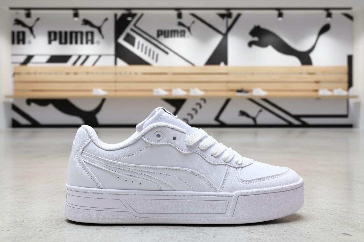 Puma White Leather Sneakers, stylish low-top design, durable sole, perfect for casual wear, street fashion, and everyday comfort.