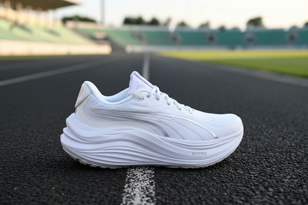 Puma Nitro running shoes in sleek all-white design, offering lightweight comfort, responsive cushioning, and modern style for daily runs or casual wear.