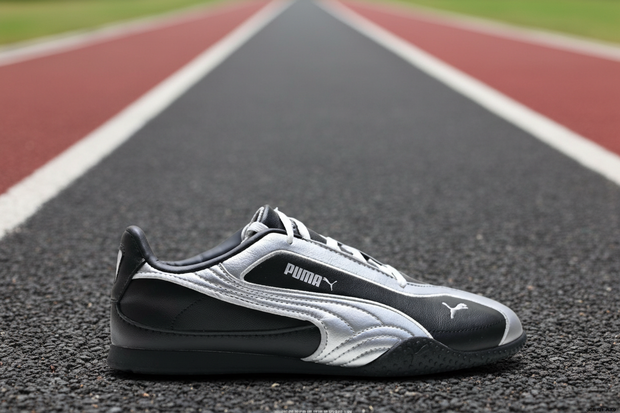 Puma black and silver low-top sneakers with sleek leather design, cushioned comfort, and durable outsole for casual and sporty wear.