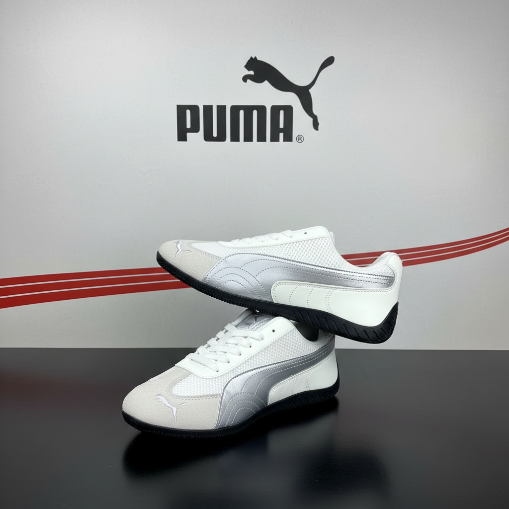 Puma white silver low-top sneakers with breathable mesh, durable sole, and sleek design for casual and athletic wear.
