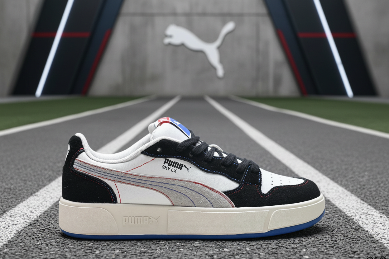 PUMA Sky LX sneakers feature a retro design with black, white, and red accents, durable suede and leather upper, cushioned sole, and stylish comfort for everyday wear.