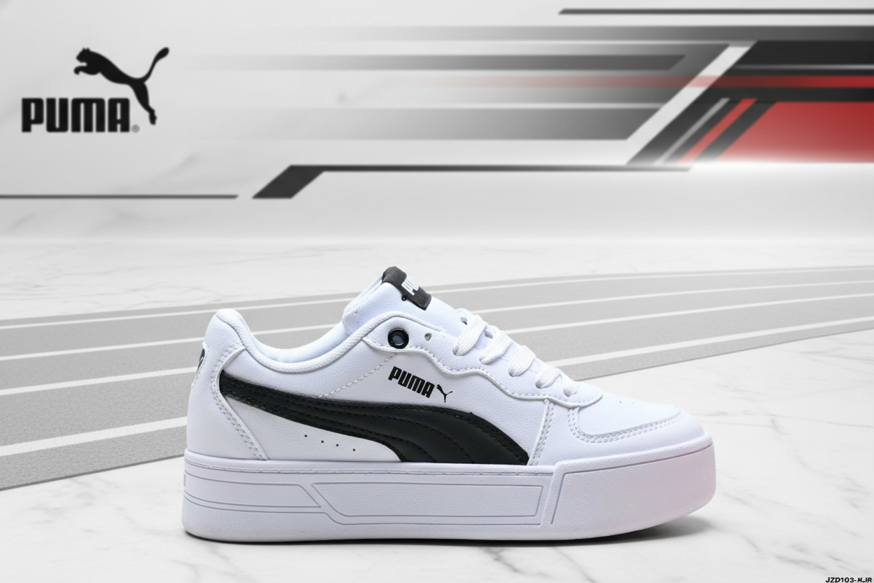 PUMA white leather sneakers with black stripe, breathable design, cushioned sole, stylish and durable for casual wear and sports