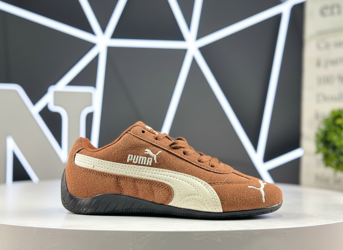 PUMA brown suede sneakers with white stripe, durable rubber sole, and classic low-top design, perfect for casual wear and sports, available in sizes 36-45.