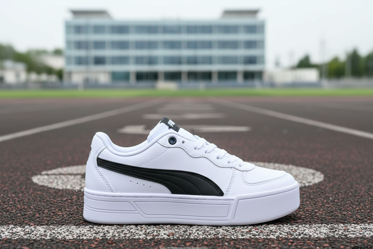 PUMA Women’s White Platform Sneakers – Stylish casual shoes with black stripe detail, breathable comfort, durable rubber sole, perfect for streetwear, walking, and daily fashion outfits.