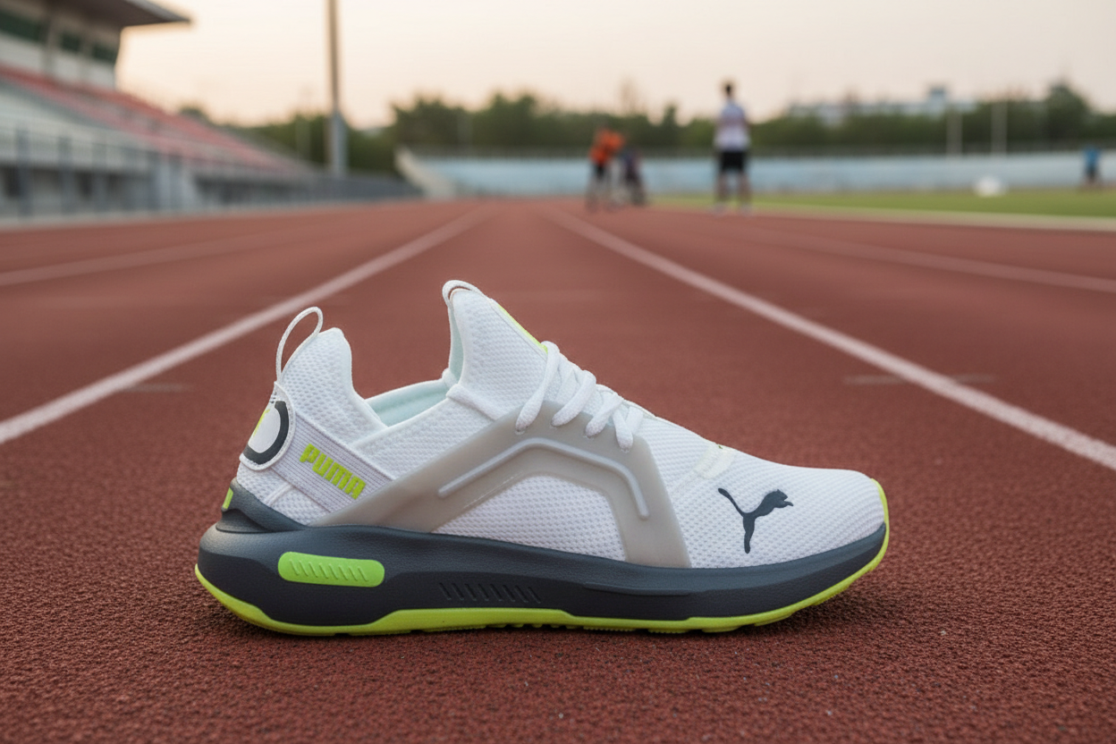 PUMA Men’s Lightweight Running Shoes, breathable mesh sneakers with cushioned sole, stylish white and neon design for sport, gym, and daily wear.