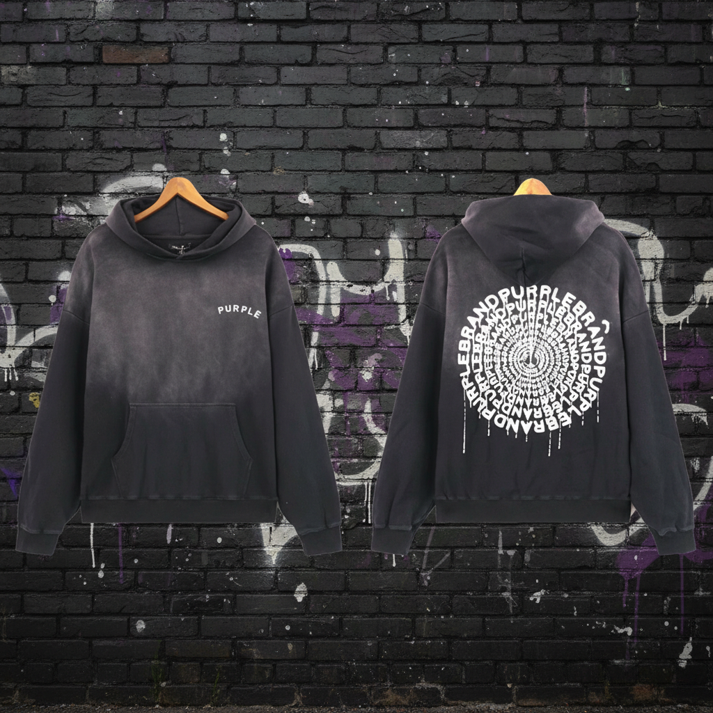 Purple Brand Black Graphic Hoodie, stylish streetwear with front logo and bold spiral text back print, soft cotton blend for comfort and casual fashion.