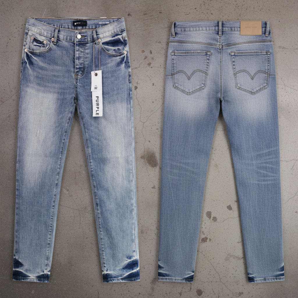 Purple Brand Men’s Light Wash Slim Fit Jeans, stylish distressed denim, classic 5-pocket design, premium quality casual wear for everyday comfort and fashion.