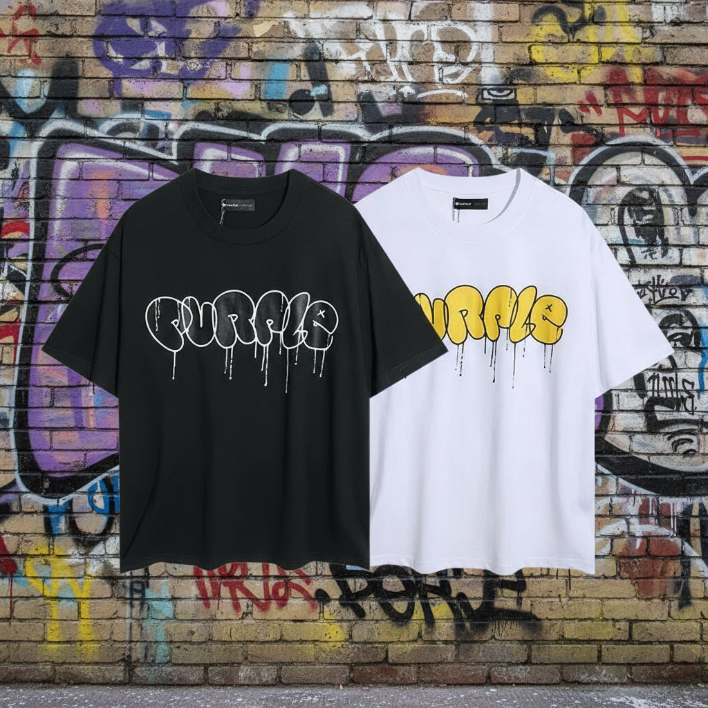 Purple Graphic Tee – Stylish streetwear T-shirt with drip graffiti logo, available in black or white, perfect for casual wear and urban fashion.