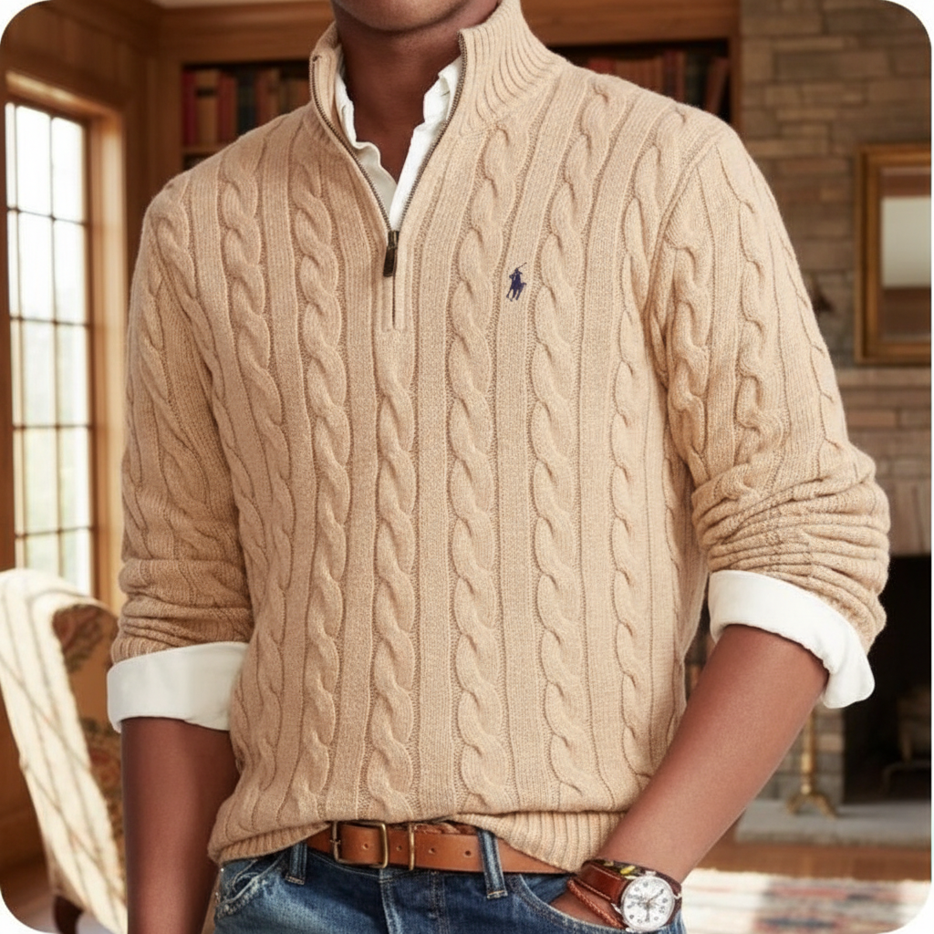 Ralph Lauren men’s cable knit half-zip sweater, classic beige cotton, soft and stylish, perfect for casual or smart wear in all seasons.