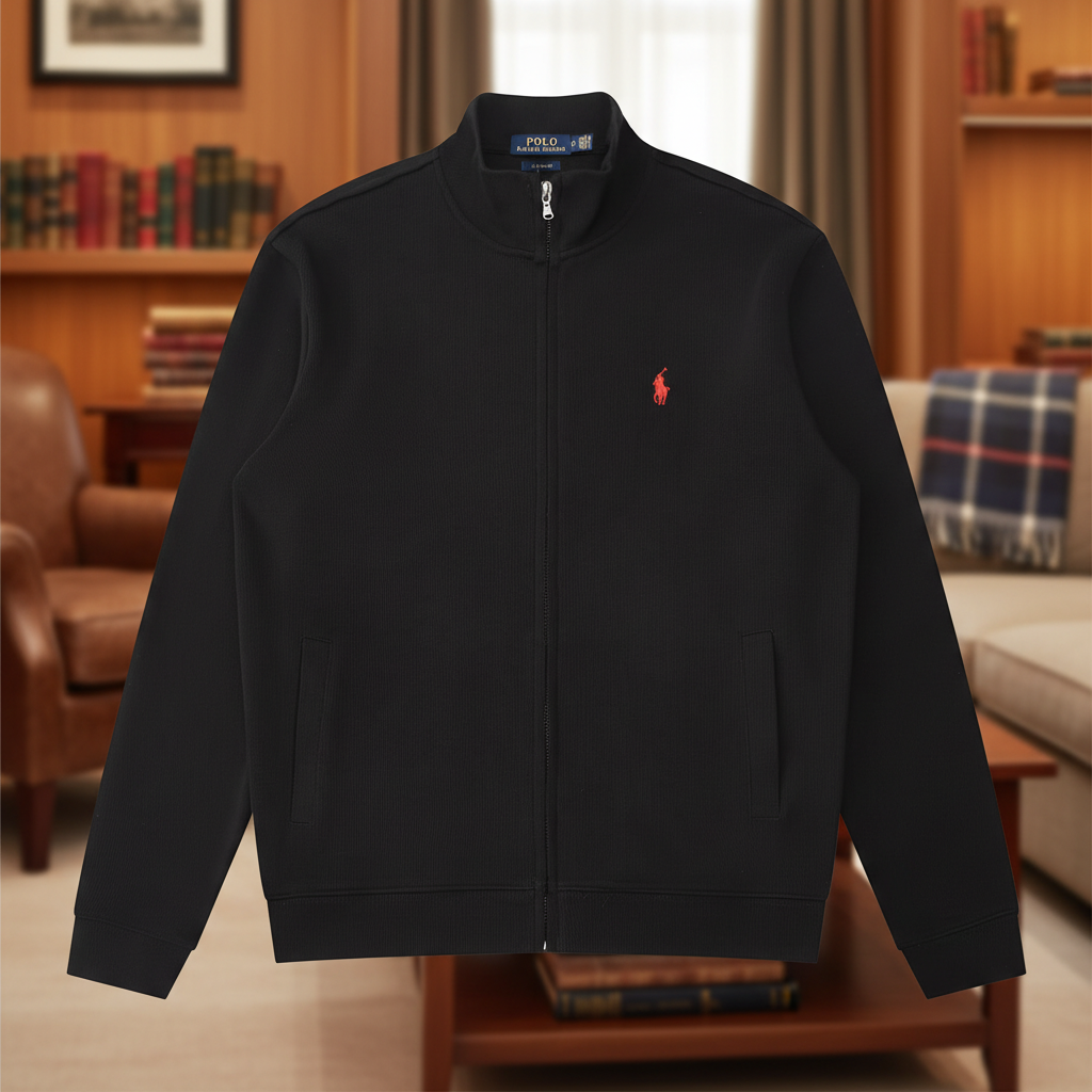 Ralph Lauren Polo black zip-up jacket with red logo, stylish casual outerwear for men, premium quality comfortable fit, perfect for everyday wear.