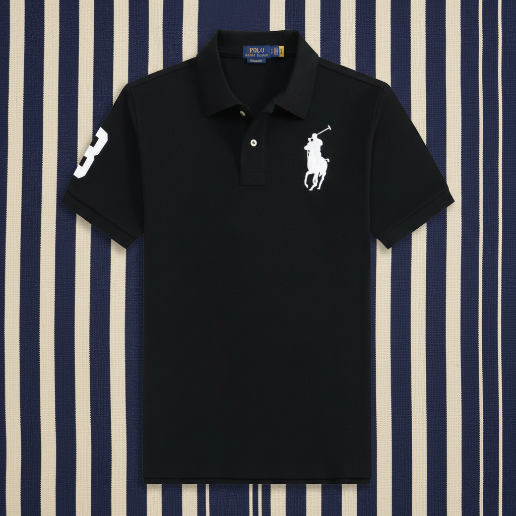 Ralph Lauren Men’s Black Polo Shirt with Iconic Big Pony Logo and Number 3 Sleeve, Classic Fit, Short Sleeve Casual Fashion Top.