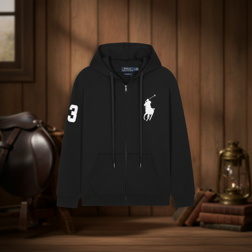 Ralph Lauren Polo black zip-up hoodie with iconic big pony logo, number 3 sleeve detail, drawstring hood, and front pockets for casual sporty style.
