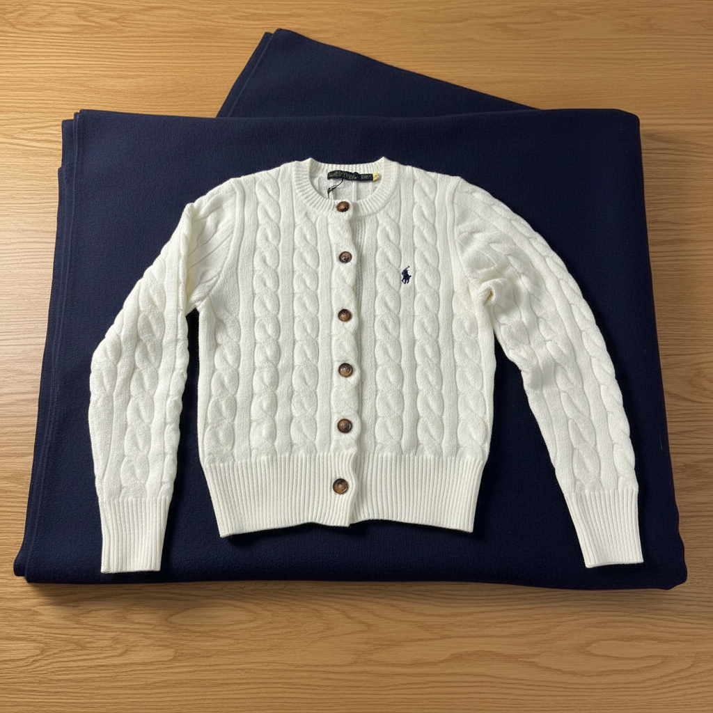 Ralph Lauren women’s cable knit button-front cardigan sweater, classic white, cozy and stylish for autumn and winter layering.