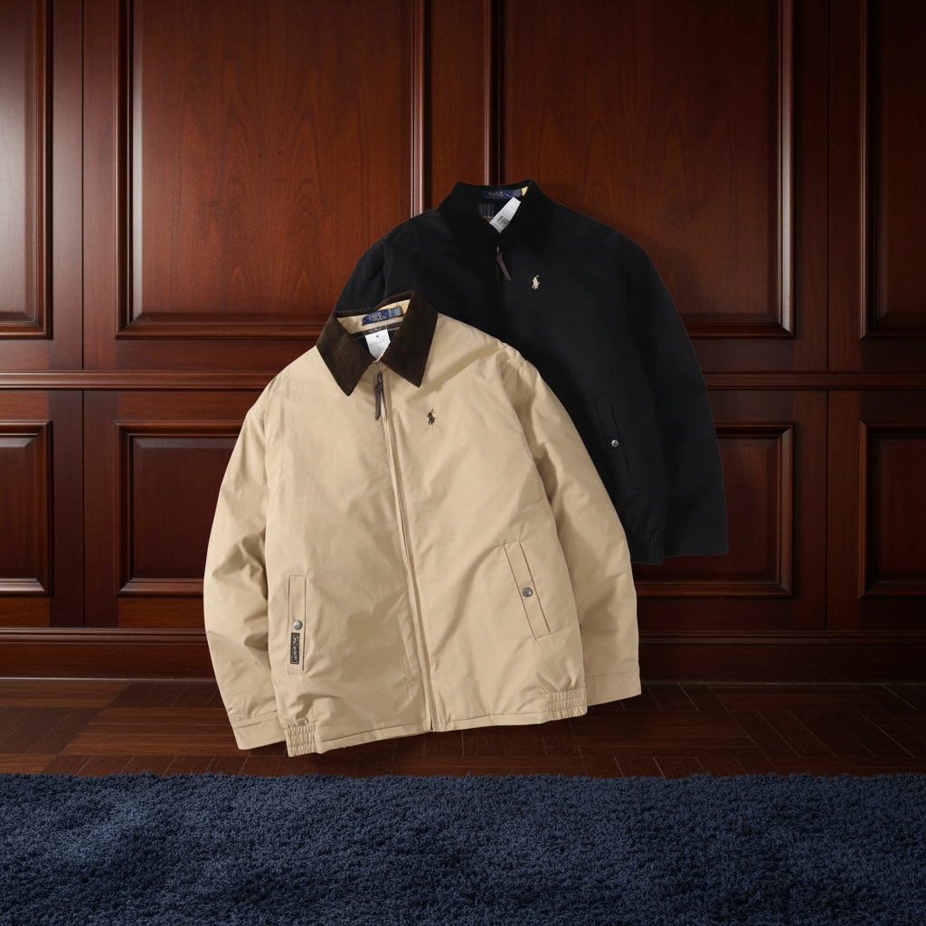 Ralph Lauren men’s casual jackets, classic design with zip front and embroidered logo, available in black and khaki, perfect for stylish everyday wear.