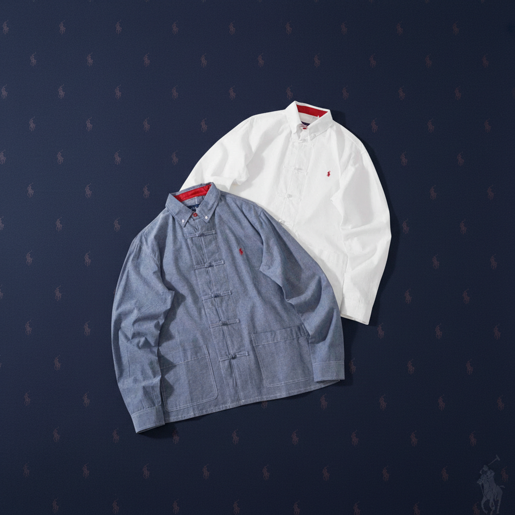 Ralph Lauren men’s Tang-style button shirt, long sleeve, casual design, available in white and blue, premium cotton, stylish blend of tradition and modern fashion.