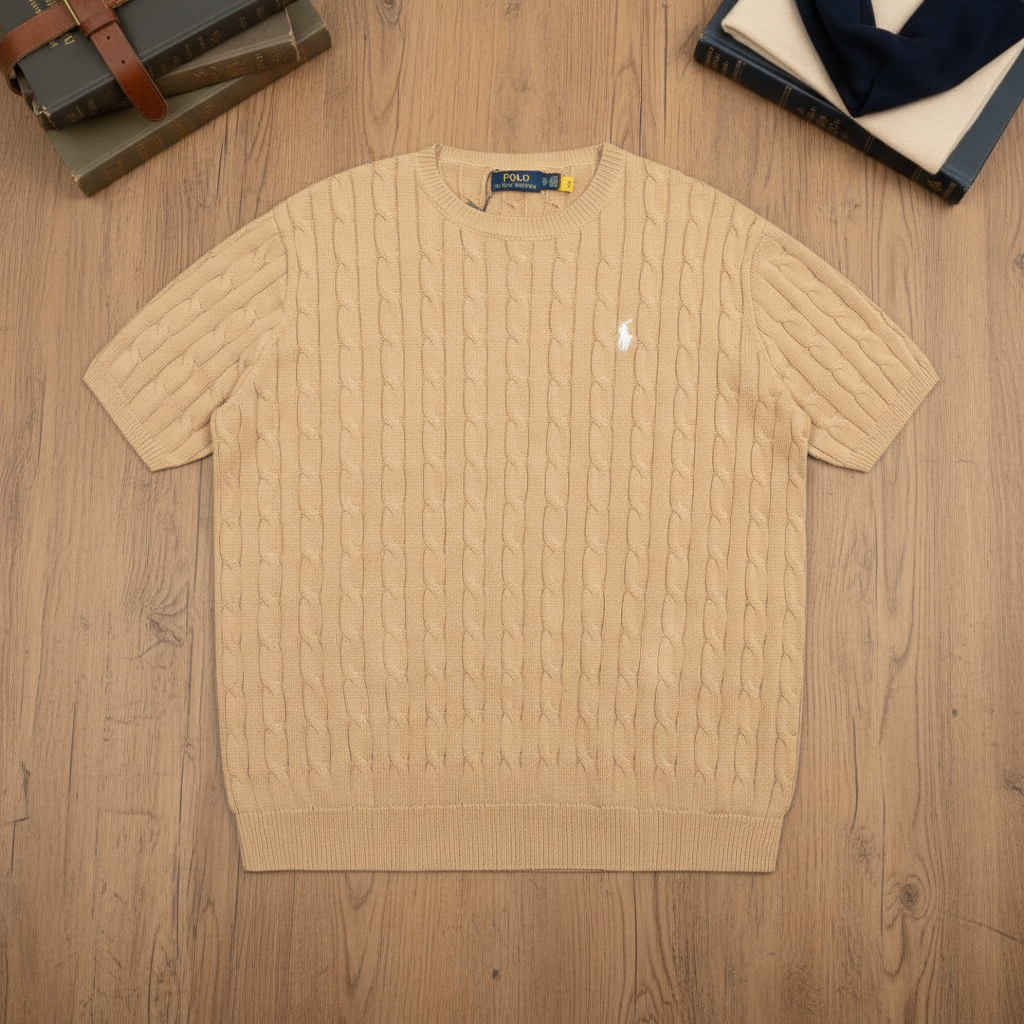 Ralph Lauren Polo short-sleeve cable knit sweater, classic beige color, soft cotton fabric, timeless style for casual and smart wear.