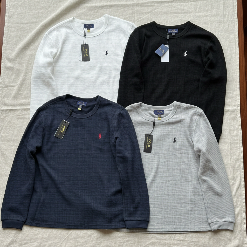 Ralph Lauren Polo long sleeve T-shirts for men, classic crew neck, soft cotton, casual fashion style, available in white, black, navy, and grey.