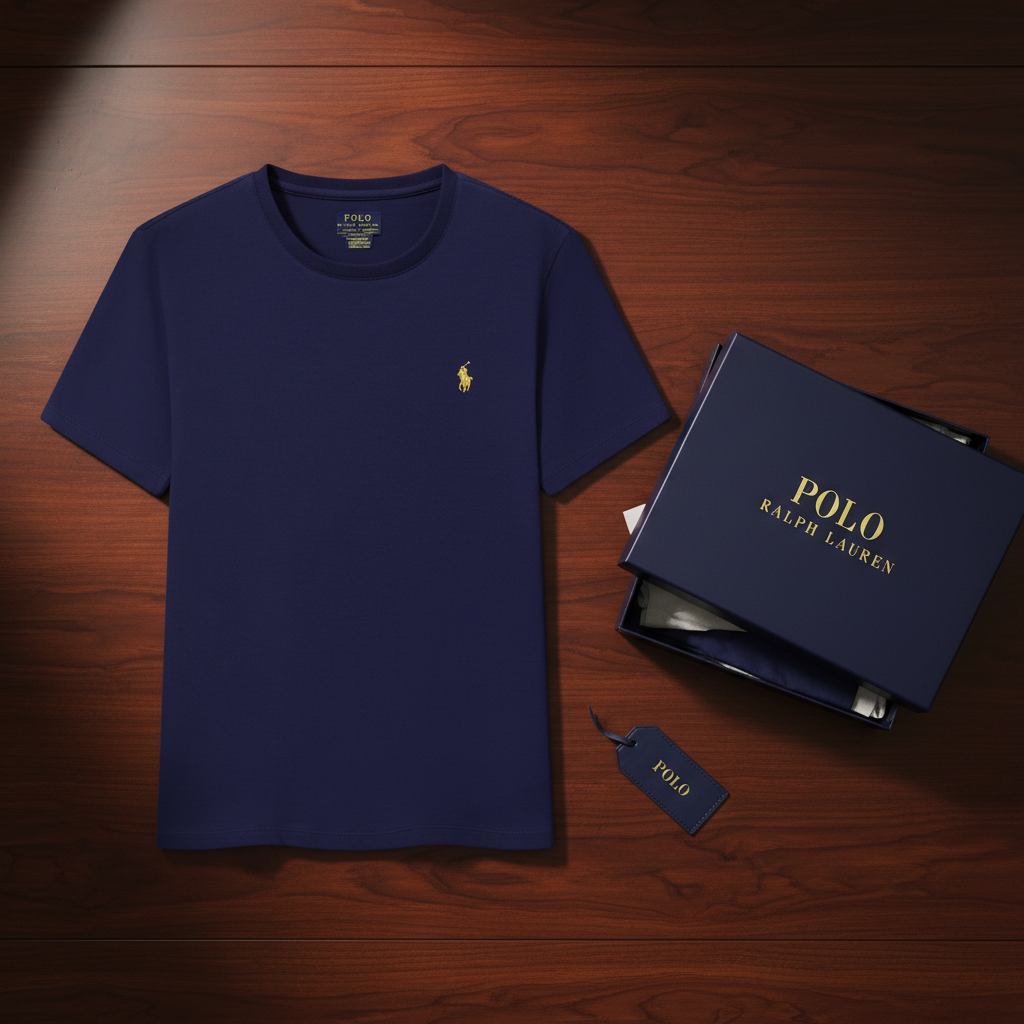 Ralph Lauren Polo navy blue cotton T-shirt with classic crew neck and signature embroidered pony logo, perfect for casual and stylish everyday wear.