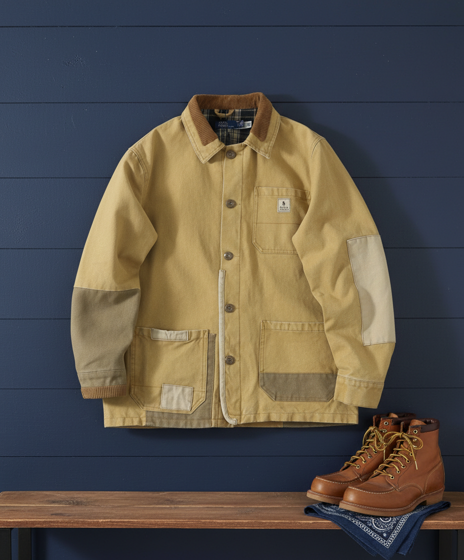 Ralph Lauren Polo workwear jacket with corduroy collar, multi-pocket design, vintage patchwork style, durable cotton fabric for casual outdoor wear.