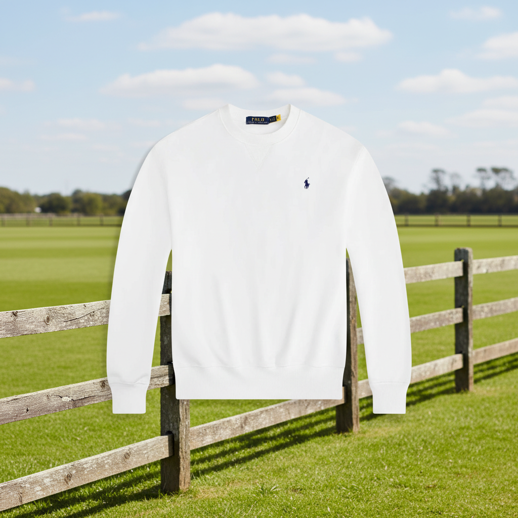 Ralph Lauren classic white crewneck sweatshirt, soft cotton fabric, iconic Polo logo, perfect for casual wear, comfortable fit for everyday style.
