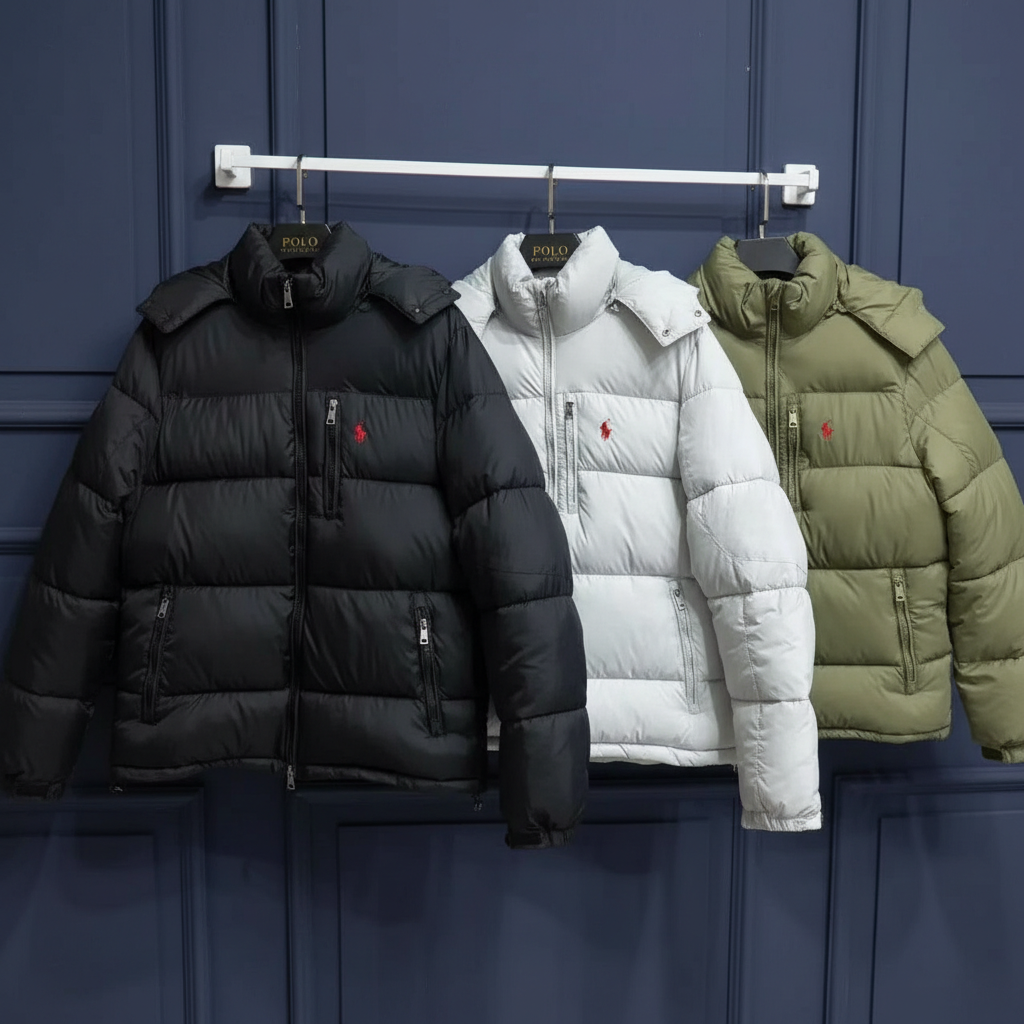 Ralph Lauren Men’s Winter Puffer Jacket, Warm Lightweight Down Coat with Zip Pockets, Stylish Outdoor Sportswear in Black, White, and Army Green.