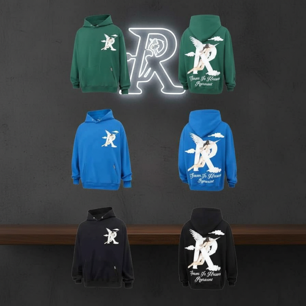 HoodiesRepresent Angel Graphic Hoodie, stylish streetwear with front logo and back winged design, comfy unisex pullover for casual and urban fashion.