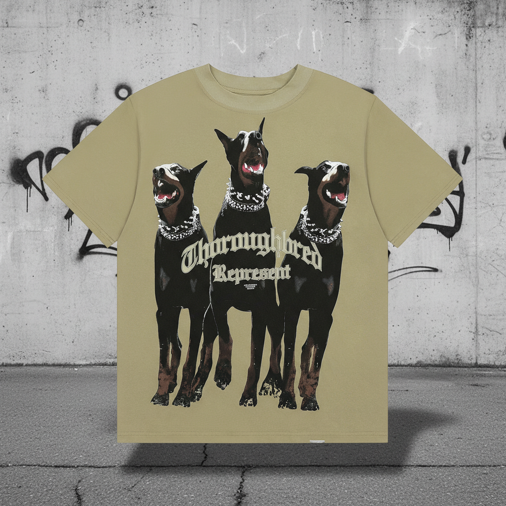 Represent Thoroughbred T-Shirt featuring bold graphic of three Dobermans, premium cotton, streetwear style, perfect for casual and urban fashion lovers.