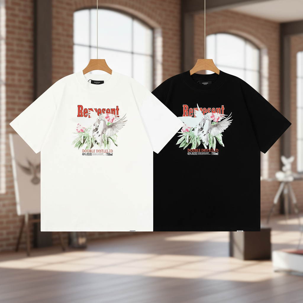 Represent T-Shirts, stylish graphic tees with floral and bird print, available in black and white, perfect for casual wear and street fashion lovers.