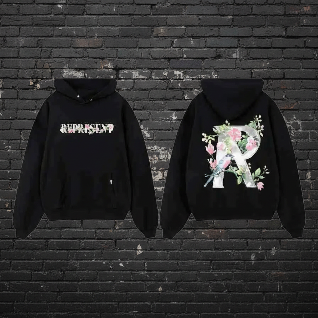 HoodiesRepresent floral print black hoodie, trendy streetwear with bold R design, soft fabric, perfect for casual wear and layering in all seasons.