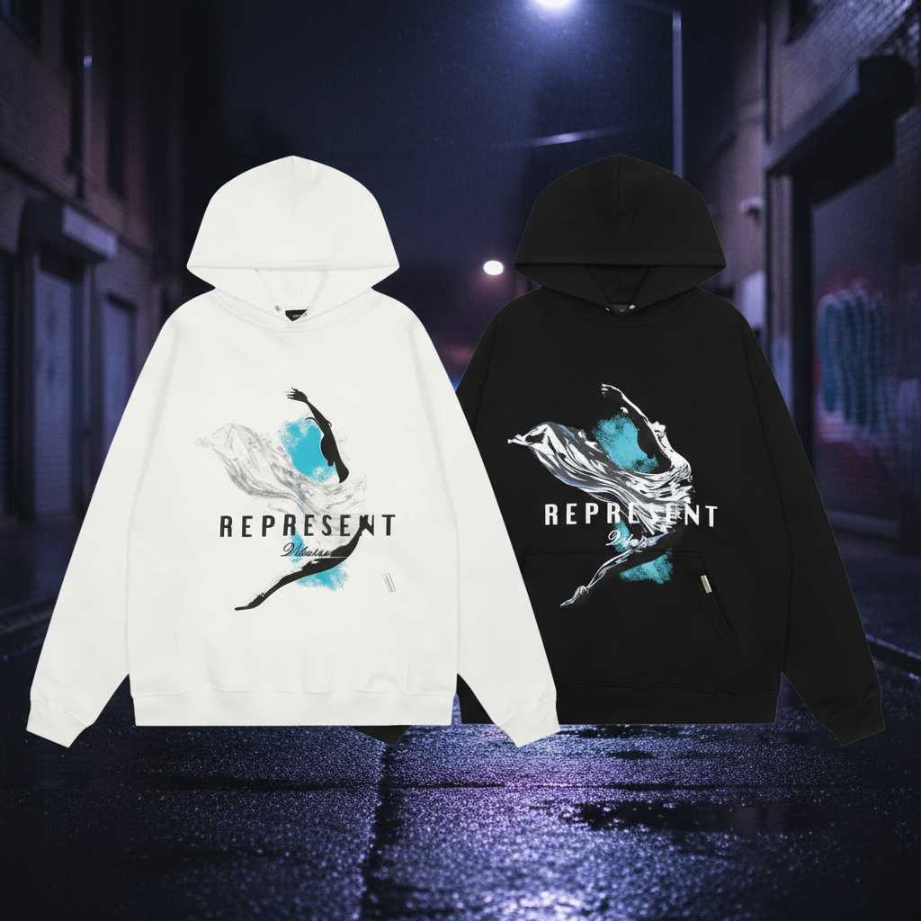 Represent Hoodie Dance Graphic Sweatshirt, stylish black and white colors, premium cotton, comfortable fit, perfect for streetwear and casual fashion lovers.