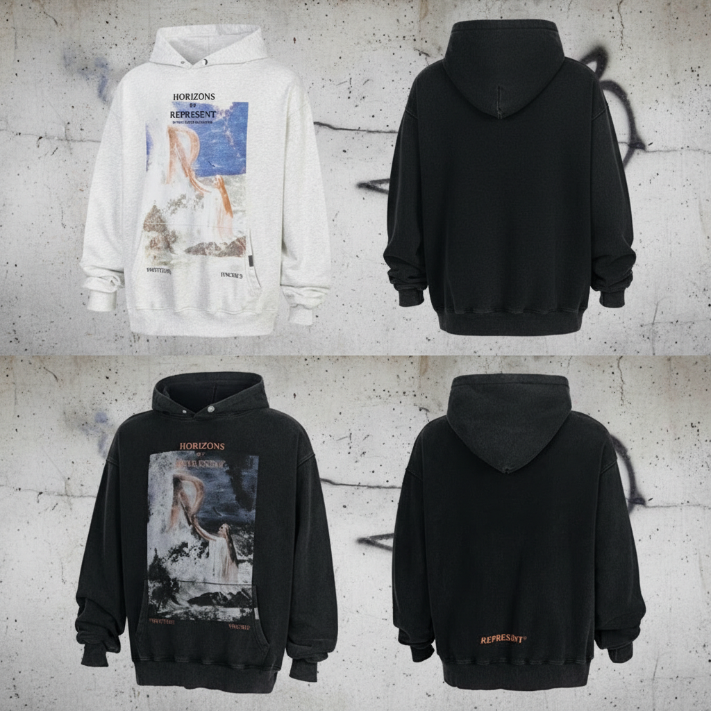 REPRESENT Horizons graphic hoodie, premium cotton, oversized fit, streetwear style, casual comfort, perfect for autumn and winter fashion.