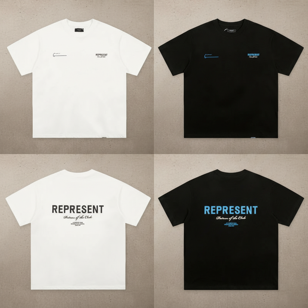 REPRESENT T-Shirts – Premium cotton streetwear in classic black and white, minimalist front logo and bold back print, perfect for casual outfits and modern urban style.