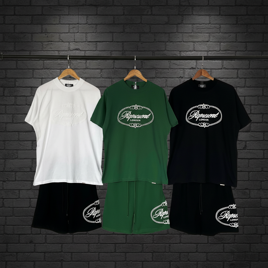 Represent London casual matching T-shirt and shorts set, stylish summer streetwear for men, available in white, green, and black, premium comfort fabric.