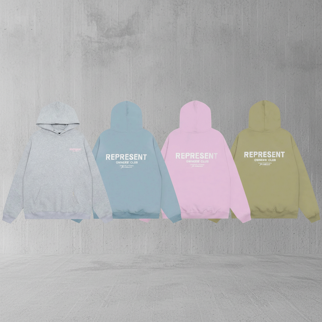 HoodiesRepresent stylish unisex pullover hoodies, soft cotton blend, cozy fit, perfect for casual wear, available in gray, blue, pink, and khaki colors.