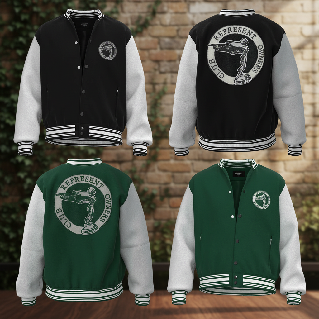 JacketsRepresent Owners Club varsity jacket with contrast sleeves, embroidered logo, and classic baseball style, perfect for casual streetwear and all-season comfort.
