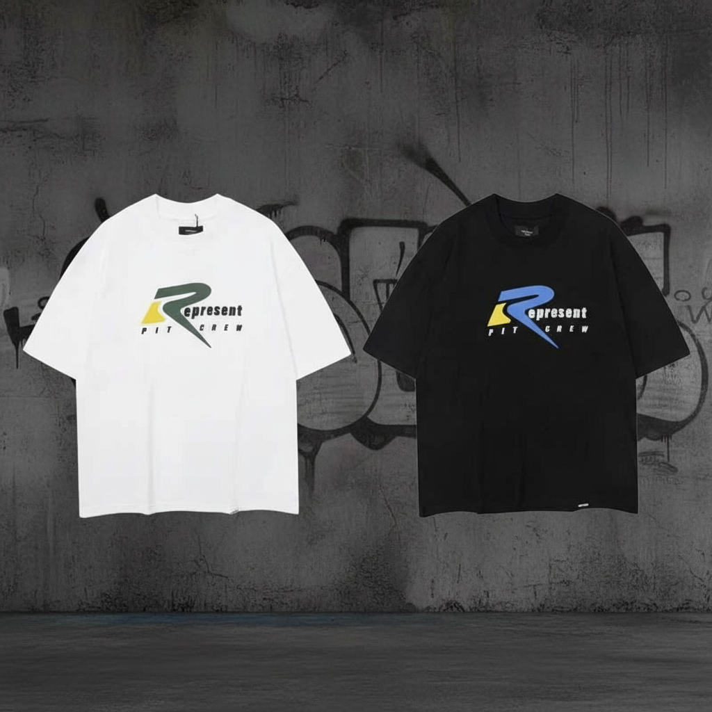 Represent Pit Crew T-Shirt, casual unisex short sleeve top, streetwear style in black or white, premium cotton, perfect for daily wear and fashion outfits.