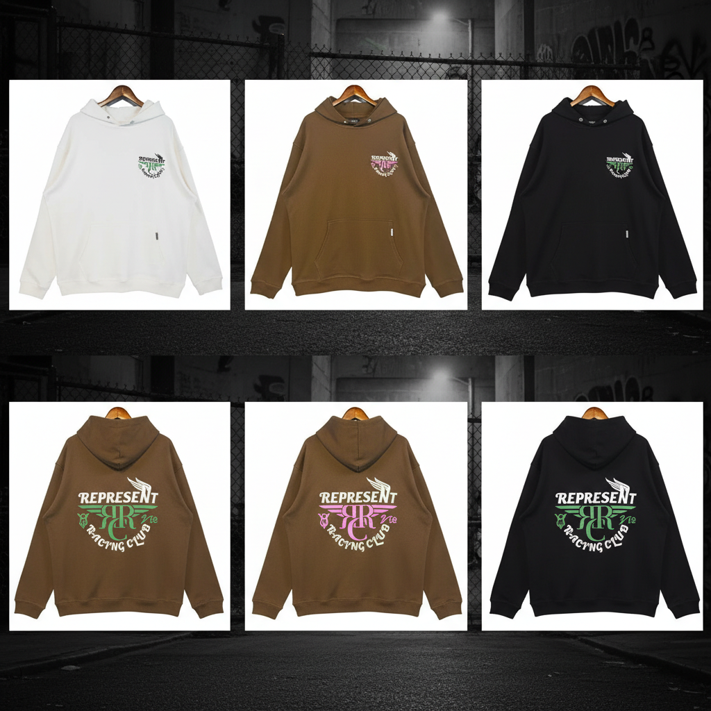 Represent Racing Club Hoodies, stylish streetwear with bold graphic prints, premium comfort, and versatile colors for casual and sporty looks.