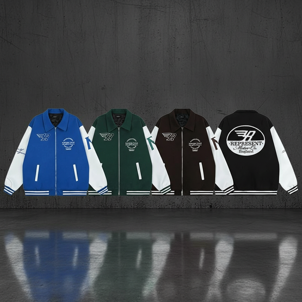 Represent Varsity Jacket, stylish streetwear with embroidered logo, contrast sleeves, and zip closure, perfect for casual or sporty looks.