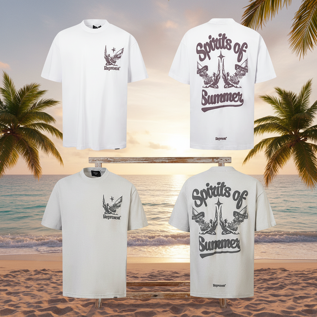 Represent Spirits of Summer graphic t-shirt, premium cotton, casual streetwear style, front eagle print, bold back design, perfect for summer fashion and everyday wear.