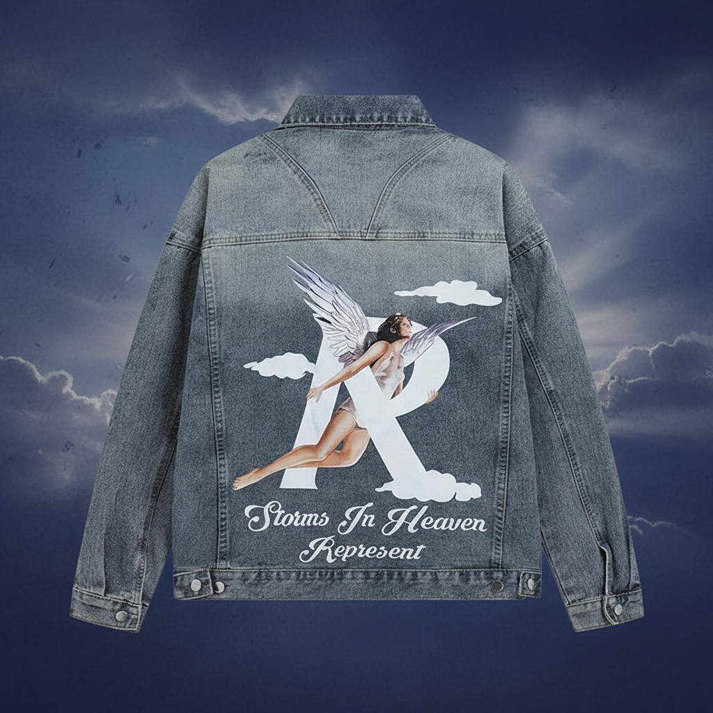 Represent Storms In Heaven Angel Print Denim Jacket, stylish vintage wash outerwear for streetwear fashion and casual outfits.