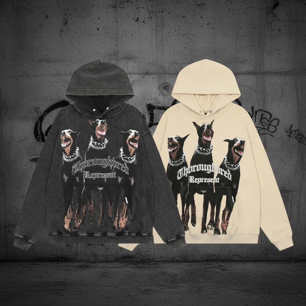 Represent Hoodies, stylish streetwear with fierce Doberman print, premium cotton, oversized fit, perfect for casual fashion and hip hop style enthusiasts.