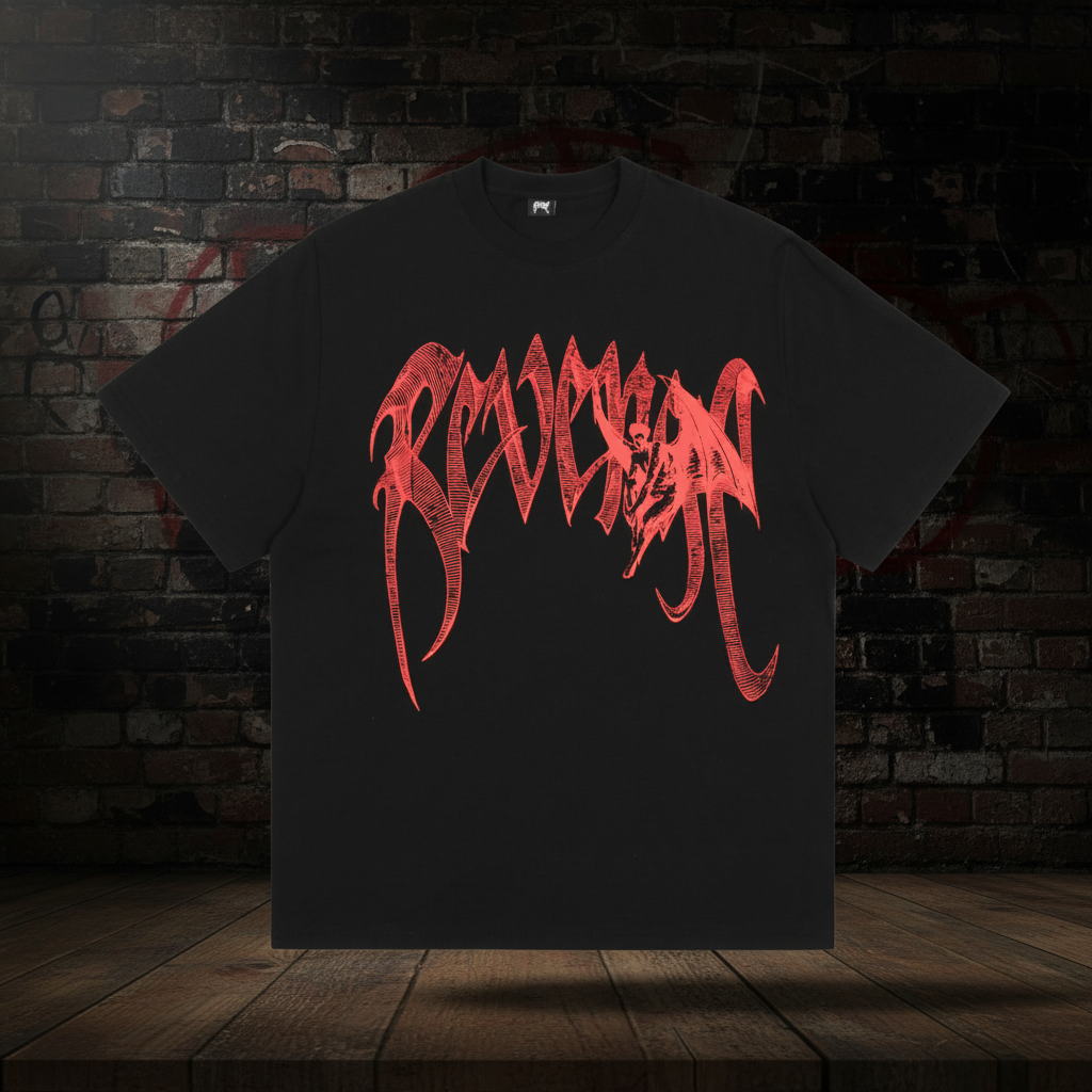 / Revenge Black Cotton Tee: Street Hip-Hop Unisex Top with Red Logo