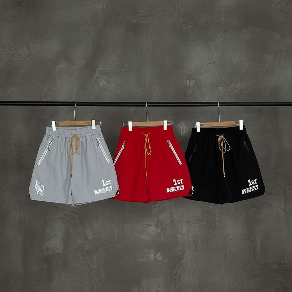 Rhude men’s casual sports shorts with zip pockets, drawstring waist, and bold 1ST print, available in grey, red, and black for streetwear style.