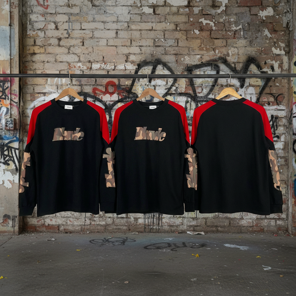 Rhude men’s long sleeve t-shirt with red shoulders and camo logo sleeves, streetwear style, casual black top for fashion-forward looks.