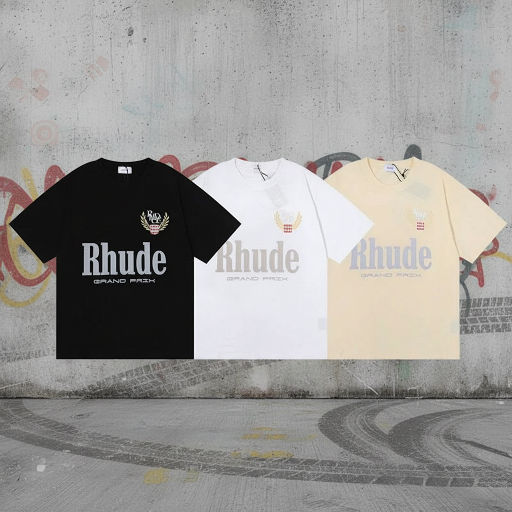 Rhude Grand Prix T-Shirt, premium cotton, stylish streetwear design, available in black, white, and beige for casual and trendy everyday wear.