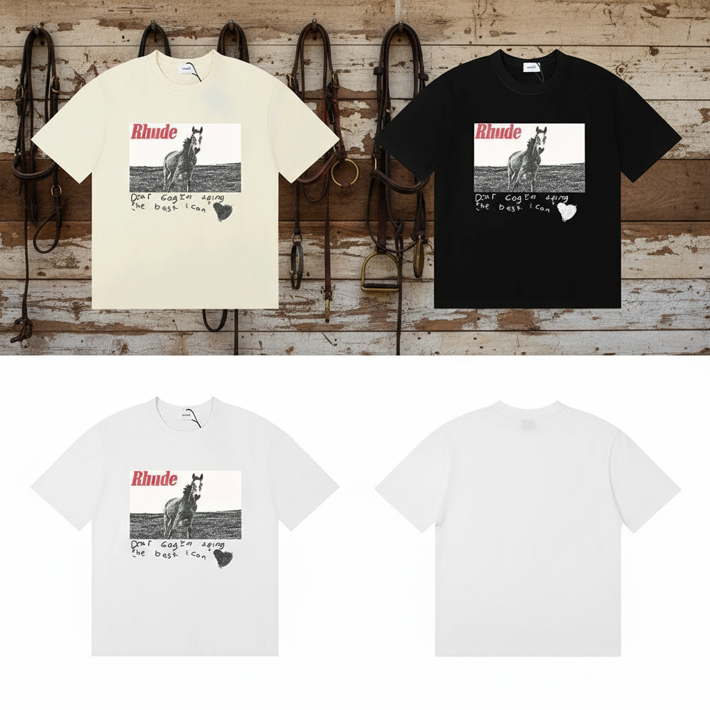 Rhude T-Shirt featuring artistic kangaroo print, retro logo design, and premium cotton fabric for casual streetwear style.