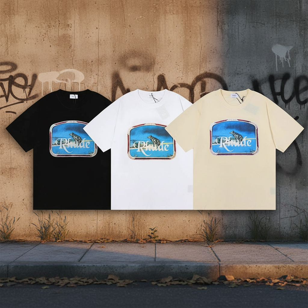 Rhude T-Shirts feature a bold graphic design, crafted from premium cotton for everyday comfort and modern street style. Available in black, white, and beige for versatile fashion.